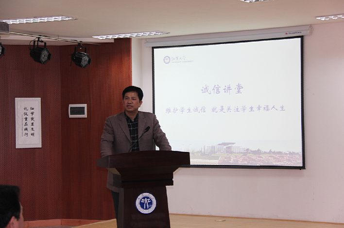 活动开始之际,在赵兴部长提议下,全体人员为4・20四川雅安地震中遇难的同胞默哀一分钟。随后,武汉市学生资助管理中心主任李彪致辞。李彪主任简要介绍了生源地助学贷款的历史演变和政策导向,概述了武汉市学生资助工作的现状,肯定了江汉大学学生资助工作的成绩,提出了进一步做好学生资助工作的思路和希望。 黄陂区学生资助管理中心副主任向彪成作了“维护学生诚信就是关注学生幸福人生”的专题报告。他结合黄陂区学生资助的工作实际,为大家解读了学生诚信与幸福人生的相互关系,重点介绍和分析了生源地贷款偿还的相关政策和工作流程;列举工作中的真实案例提醒在座的学生高度偿还贷款的注意事项。报告激起了现场学生的强烈共鸣,大家感动受益匪浅,纷纷表示要树立良好的诚信意识,诚信做人,诚信做事,常怀感恩之心,努力践行承诺,用实际行动回报国家、回报社会。 党的十八大报告中明确提出,全面提高公民道德素养,是社会主义道德建设的基本任务,要推进公民道德建设工程,引导人们自觉履行法定义务、社会责任、家庭责任,加强政务诚信、商务诚信、社会诚信和和司法公信建设。江汉大学历来高度重视培养学生的道德素质,围绕文明创建活动,经常开展诚信教育。“诚信讲堂”就是学校资助管理中心为贯彻“助困育人”精神而开展的一项主题活动,已经连续举办两年,产生了良好的教育效果和社会影响。江汉大学的学生资助工作取得了良好的成绩,受到了上级部门的肯定和表扬,这与学校重视开展诚信教育活动是密不可分的。 赵兴部长在活动结束前要求各个学院进一步提高对资助工作重要性的认识,认真做好这项工作,一是要继续加强对国家资助政策的宣传,二是要在更多的学生中加强诚信教育,使江大的学生资助工作在已有的基础上迈上一个新台阶。 ![]()
