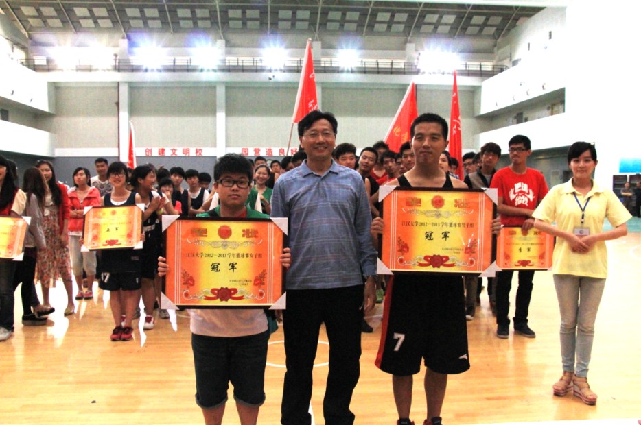本次篮球赛决赛得到了体育学院的大力支持,体育学院徐国栋院长也亲临现场观看比赛,比赛结束后,随着颁奖音乐响起,徐国栋院长、校团委副书记程�老师分别为为篮球赛三甲颁奖。