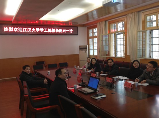 12月13日上午,校党委学工部赵兴部长一行前往武汉大学党委学工部、团委走访调研,受到了武汉大学党委学工部徐东兴部长、陈东明副部长、团委文云冬副书记的热情接待。本次走访调研重点了解武汉大学的学生思想政治教育体系、学生工作队伍建设、学生事务管理、资助工作和共青团工作,武汉大学的几位领导对此作了详细介绍,对我们如何更好地开展工作、提升水平具有重要的启示和借鉴作用。赵兴部长一行应邀参观了武汉大学学生服务中心。该中心包括学生事务服务和学生发展服务两大区域,功能健全,服务完善,效率较高。其中学生事务服务采取一站式的窗口服务,与此密切相关的各部门分别在此设立办事窗口,集中办理考务、后勤、出国(境)、就业、医疗保险、生源地贷款等服务;学生发展服务主要有心理咨询、学生社团活动、生涯规划、小型沙龙活动等。
