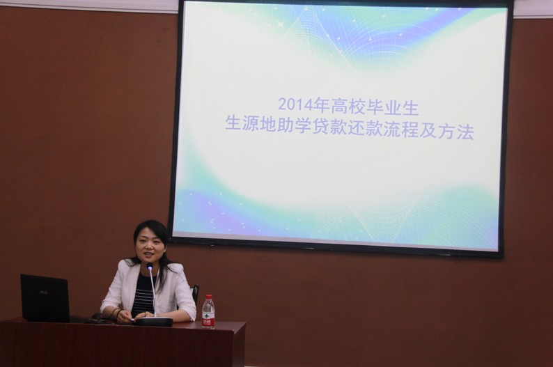 学生处、学生资助管理中心在师生活动中心举行2014届生源地信用助学贷款毕业生诚信报告会暨还款培训会,会议邀请到国家开发银行湖北省分行的客户经理金俊经理和武昌区学生资助管理中心的毛颖慧老师为大家作报告,学生处副处长刘妙龄出席会议并讲话。