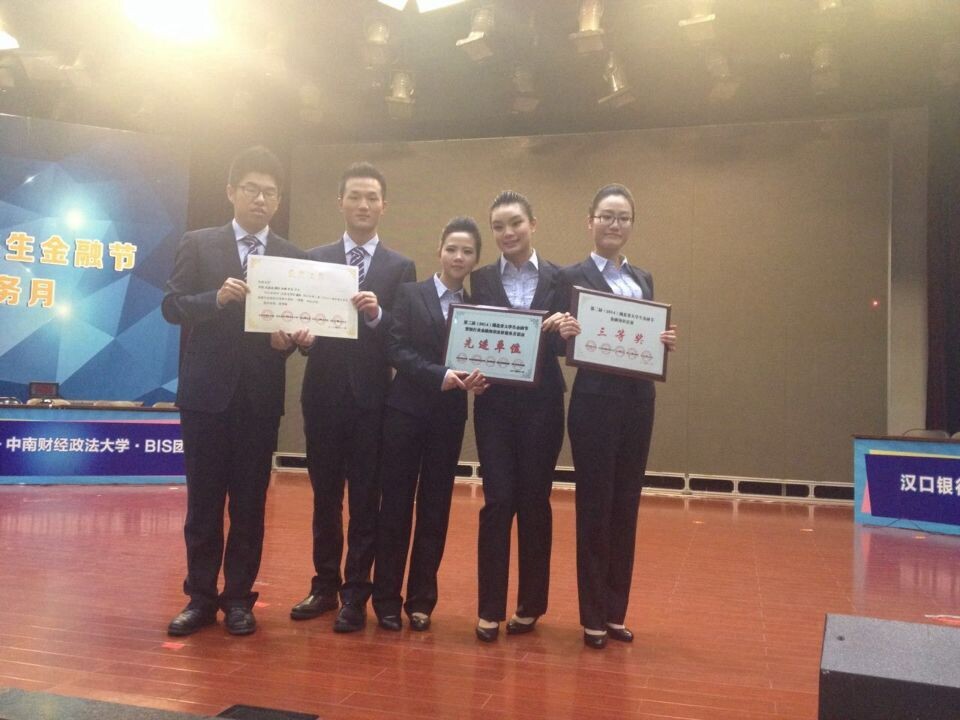 21日,由团省委、省金融办、省银监局、湖北日报传媒集团和省学联共同举办的第二届湖北省大学生金融节暨银行业金融知识宣传服务月金融知识总决赛在武汉举行。经过两个多月5轮激烈角逐,我校商学院代表队从80余支队伍中脱颖而出与武汉大学、中南财经政法大学和湖北经济学院四支高校队伍进入总决赛,当日以第四名的成绩获得三等奖。同日,我校凭借金融节期间高效的组织管理能力被组委会授予优秀组织奖。